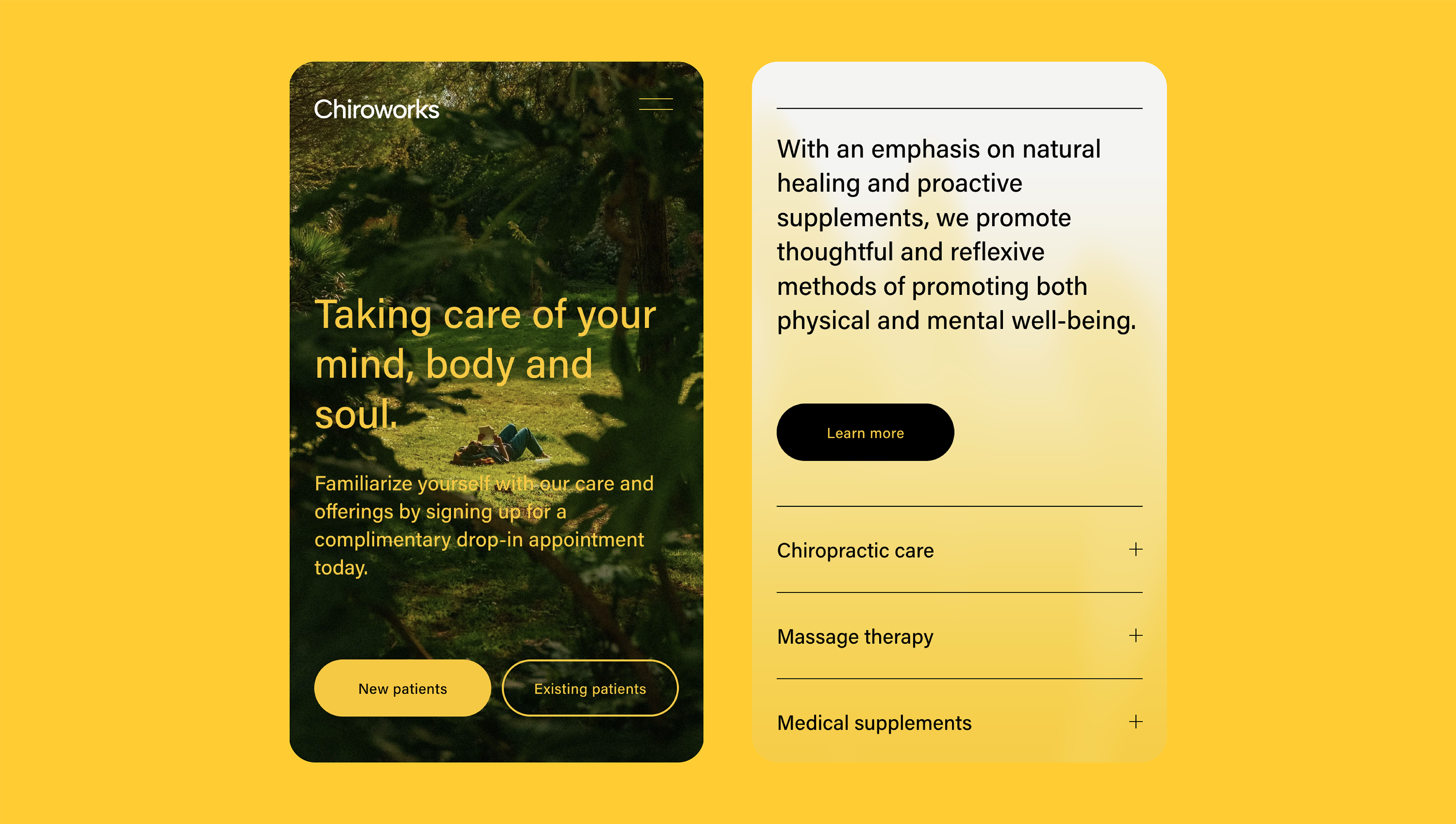 The core of chiropractic is achieving health through natural healing practices and incorporated this when designing. I realized it was more than a healthcare clinic, but a community based experience that was offered. I noticed that patient and staff treat each other as family and this clinic needed a visual identity that keeps the core values of the business intact and amplified.